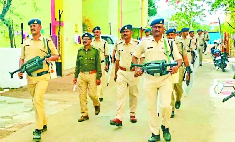 फ्लैग मार्च करते पैरामिलिट्री जवान और होमगार्ड