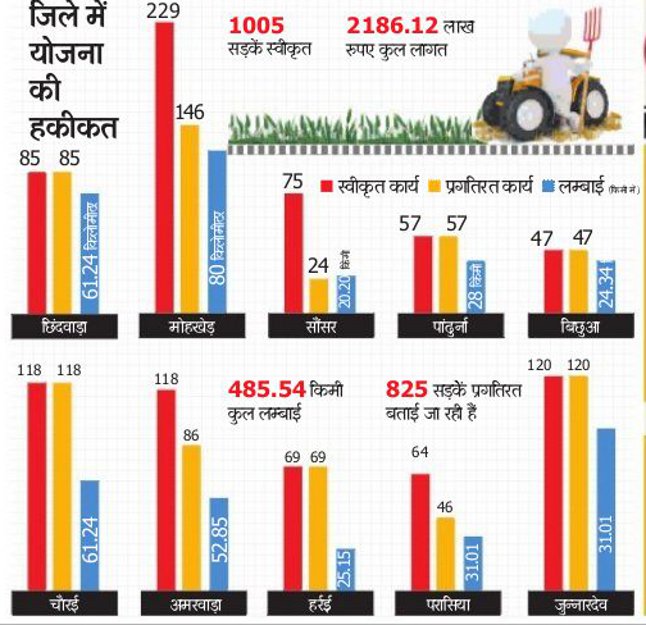 जिला पंचायत से मिले आंकड़े अधिकारियों की लापरवाही खुद बयां कर रहे हैं। योजना के तहत जिलेभर में 1005 सड़कें स्वीकृत हैं जिनकी कुल लम्बाई 485.54 किमी है। इन 1005 सड़कों की कुल लागत 2186.12 लाख रुपए है।