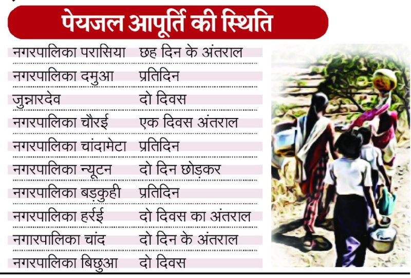 छिंदवाड़ा जिले के शहरी क्षेत्रों में इस समय जून के महीने में जल संकट और गहरा गया है। सबसे ज्यादा खराब स्थिति परासिया की है। छह दिन के अंतराल में एक दिन बार पानी वितरित हो रहा है। दो से तीन दिन के अंतराल में न्यूटन, जुन्नारदेव, चांद में पानी देने की नौबत बन रही है। यहां पेयजल परिवहन की स्थिति है। निजी बोरवेल अधिग्रहण की स्थिति यह है कि परासिया के नगरीय क्षेत्र में बोरबेलों का अधिग्रहण कर रामपुरा टंकी के माध्यम से परासिया नगर में जल आपूर्ति की जा रही है। पेयजल स्थित डोह से पम्पिंग कर जल संग्रहण कर संबंधित वार्डों में पानी पहुंचाया जा रहा है।