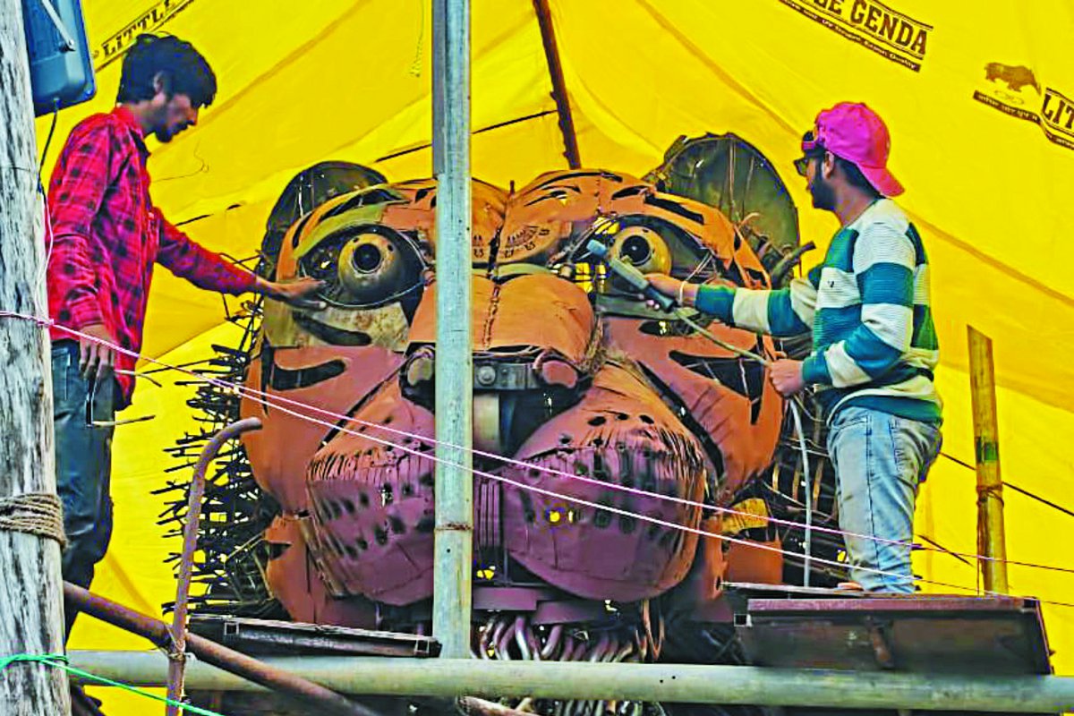 पेंच टाइगर रिजर्व के खवासा गेट पर लोहे के कबाड़ से दुनिया के सबसे बड़े बाघ के स्टेच्यू का निर्माण किया जा रहा है। अक्टूबर से खवासा गेट से कोर जोन में जंगल सफारी का लुत्फ उठाने वालों को प्रवेश करते ही विशालकाय बाघ के स्टेच्यू का दीदार होगा। इसे देखकर पर्यटक रोमांचित हो उठेंगे। पेंच प्रबंधन खवासा गेट के पास ही लोहे के कबाड़ से बाघ का स्टेच्यू बनवा रहा है। यह दुनिया के सबसे बड़े बाघ की प्रतिमा कहलाएगी। बड़ी बात यह है कि बाघ को रूप देने के लिए स्थानीय कलाकारों को ही चुना गया है। स्टेच्यू का काम जनवरी माह में शुरू किया गया था और अब यह लगभग पूर्ण होने को है।