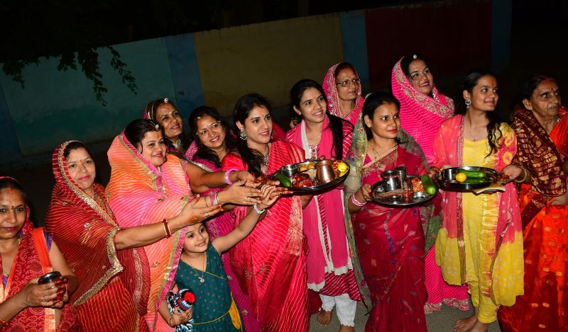 तीज पर अजमेर के नगर में चांद की पूजा करती महिलाए।