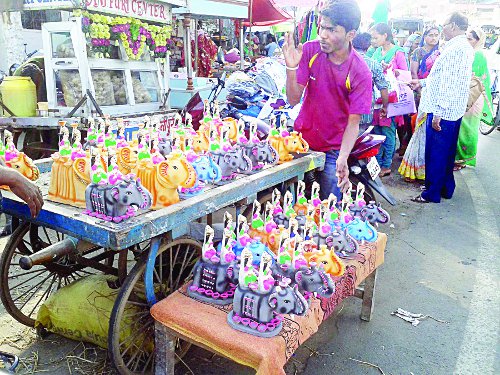 परासिया (छिंदवाड़ा). क्षेत्र में महालक्ष्मी का पर्व शुक्रवार को धूमधाम से मनाया जाएगा। पर्व पर हाथी पर सवार देवी लक्ष्मी का पूजन होता है। पूजन को देखते हुए बड़ी संख्या में हाथी की खूबसूरत प्रतिमा आज बिकने के लिए बाजार में आई। पहले क्षेत्र में मूर्तिकार लोगों के घरों से पटा लेकर जाते थे। इस पर गीली मिटटी से हाथी की प्रतिमा बनाकर देते थे। कंचों की आंखे बनाकर चने की दाल से इसे सजाया जाता था। अब बनी बनाई प्रतिमा बाजार में आती है। विभिन्न रंगों से सजी प्रतिमाएं बाजार में बिकने आई। जिसे खरीदार खदाने पहुंचे।