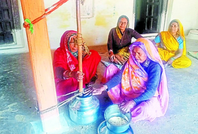 ग्राम सावरवानी में शुद्ध घी बना रही महिलाएं।