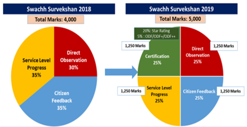 पिछले वर्ष का सर्वेक्षण सेवा स्तर प्रगति 35 प्रतिशत, नागरिक प्रतिक्रिया 35 प्रतिशत एवं प्रत्यक्ष निरीक्षण 30 प्रतिशत अंकों पर निर्धारित था, लेकिन इस बार सर्टिफिकेशन को स्टार रैंकिंग का नाम देते हुए, इसके सहित सभी को 25-25 प्रतिशत में विभाजित कर दिया गया है। मतलब प्रत्येक स्तर 1250 अंकों के होंगे। इस बार सेवा स्तर प्रगति में एक नया कम्पोनेंट बाई-लॉ भी जोड़ा गया है। स्टार रैंकिंग के माध्यम से 1250 में से 20 प्रतिशत अंक मिलेंगे और पांच प्रतिशत ओडीएफ, ओडीएफ प्लस और ओडीएफ प्लस प्लस द्वारा शहर को हासिल होंगे।