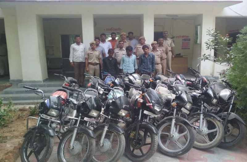 चित्तौडग़ढ़. जिले के कपासन थाना क्षेत्र में बाइक चोरी की घटनाओं पर अतिरिक्त पुलिस अधीक्षक सुखदेव जांगिड़ व उप अधीक्षक दलपतसिंह भाटी के निर्देशन में थानाधिकारी बाबूलाल के नेतृत्व में टीम गठित की गई। बाइक चोरी के मामलों में जांच कर मोडा खेड़ा निवासी मोहनलाल पुत्र गेहरु जाट व भूपालसागर निवासी गिरिराज पुत्र बोथलाल जाट को गिरफ्तार किया। उनकी सूचना से बाइक खरीदने वाले नगपुरा थाना राशमी निवासी किशनलाल पुत्र नानुराम जटिया से चोरी की 14 बाइक बरामद की है। बाइक चोरी करने वाले दोनों आरोपी मोहनलाल व गिरिराज स्मैक पीने के आदी होने से नशे की हालत में चोरी करतेथे एवं इसके बाद कम कीमत में किशनलाल को बेच देते हैा। टीम में हेड कांस्टेबल लक्ष्मण लाल व नंदलाल आदि शामिल थे।