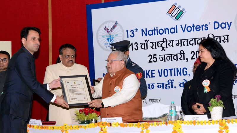 चित्तौडग़ढ़. 13 वें राष्ट्रीय मतदाता दिवस के अवसर पर बुधवार को जयपुर में आयोजित समारोह में राज्यपाल कलराज मिश्र ने जिला कलक्टर अरविन्द कुमार पोसवाल राज्य स्तरीय पुरस्कार से सम्मानित किया। यह सम्मान उन्हें निर्वाचन संबंधी समस्त कार्य पूर्ण निष्ठा एवं समर्पण के साथ संपन्न करवाने पर दिया गया।