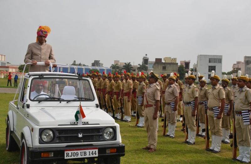 चित्तौडग़ढ़ में स्वाधीनता दिवस के जिला स्तरीय समारोह में मार्चपास्ट की सलामी लेते मुख्य अतिथि नगरीय विकास मंत्री श्रीचंद कृपलानी।