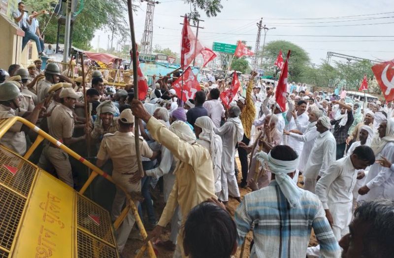 चूरू. जिले के गांवों से पैदल मार्च करते निकले किसानों का जत्थे चूरू कलक्ट्रेट परिसर के बाहर आकर मिले। इस दौरान उन्होंने बीमा क्लेम को लेकर सरकार के खिलाफ प्रदर्शन किया। किसानों की भीड़ को देखते हुए काफी संख्या में पुलिस बल तैनात किया गया था। इस दौरान किसानों को अंदर प्रवेश करने से रोकने के लिए अवरोधक लगाए गए थे। इसके बाद अंबेडकर मूर्ति स्थल पर किसानों ने सभा शुरू की। इस सभा में किसान नेताओं ने राज्य और केन्द्र की सरकार के खिलाफ जमकर आक्रोश जताया। सभा के दौरान ही डीजे के पर नाचते-गाते आए किसानों का दल जैसे ही कलक्ट्रेट पहुंचा तो उनमें जोश आ गया और जोर जबरदस्ती कर कलक्ट्रेट में घुसने का प्रयास किया। इस दौरान आपस में धक्का-मुक्की हुई। पुलिस ने संयम बरतते हुए अपने आप को काबू में रखा। किसानों ने पुलिस की ओर से लगाए अवरोधकों को गिरा दिया। उनके उपर चढ़कर पुलिस से उलझते भी नजर आए। पुलिस ने उन्हे पीछे धकेलने का प्रयास किया लेकिन किसान कलक्ट्रेट में जाने की जिद पर अड़ रहे। इस दौरान उन्होंने जमकर प्रदर्शन किया। बाद में पुलिस अधिकारियों ने ही उन्हे समझाकर सभास्थल पर जाने का आग्रह किया। इसके बाद किसान सभा स्थल पर लौट गए। सुबह से ही जिले भर से किसान पैदल कलेक्ट्रेट पहुंचने लगे थे। भारतीय किसान सभा के बैनर तले किसानों के द्वारा यहां धरना शुरू किया गया है। किसान सभा के महामंत्री एडवोकेट निर्मल कुमार ने बताया कि बकाया फसल बीमा क्लेम, क्रॉप कङ्क्षटग के आधार पर बीमा, किसानों को 6 घंटे बिजली, मनरेगा में छह सौ रुपए का भुगतान सहित 22 सूत्री मांगों को लेकर यह प्रदर्शन किया जा रहा है।