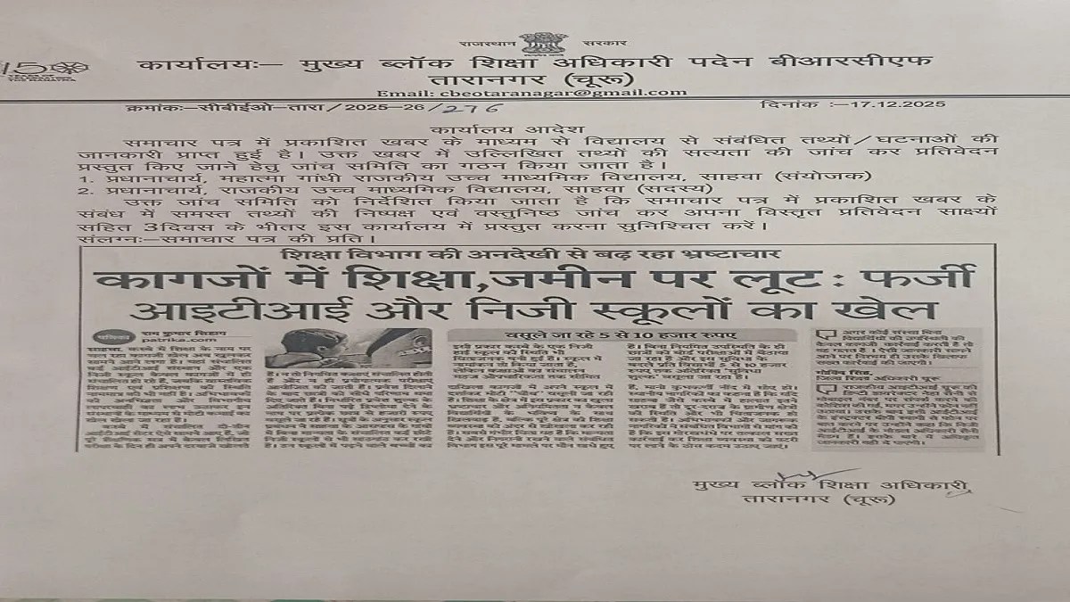मुख्य ब्लॉक शिक्षा अधिकारी तारानगर बबलेश शर्मा ने बताया कि मामले की गंभीरता को देखते हुए विभाग ने स्वतः संज्ञान लिया है। जांच प्रक्रिया प्रारंभ कर दी गई है और यदि जांच में कोई भी संस्था या व्यक्ति दोषी पाया जाता है तो प्रकरण सक्षम अधिकारियों को भेजकर नियमानुसार सख्त कार्रवाई की जाएगी। वहीं, आइटीआई संस्थानों से संबंधित जानकारी लेने के लिए तकनीकी शिक्षक इरशाद मोहम्मद से बात की गई, जिन्होंने कहा कि इस विषय में जवाब देने के लिए वे अधिकृत नहीं हैं।