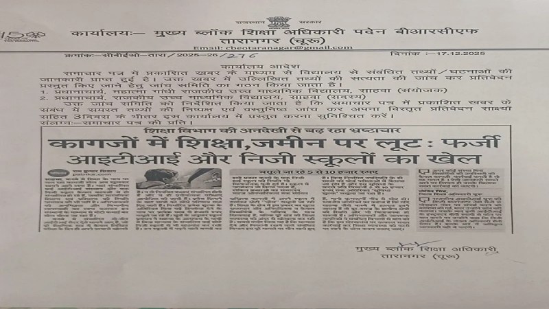साहवा. कस्बे में शिक्षा के नाम पर चल रहे कथित कागजी खेल को लेकर राजस्थान पत्रिका में प्रकाशित खबर के बाद शिक्षा विभाग ने गंभीरता दिखाते हुए जांच की कार्रवाई शुरू कर दी है। पत्रिका के बुधवार के अंक में "कागजों में शिक्षा, जमीन पर लूट: आइटीआई और निजी स्कूलों का खेल" शीर्षक से प्रकाशित समाचार पर स्वतः संज्ञान लेते हुए मुख्य ब्लॉक शिक्षा अधिकारी तारानगर ने दो सदस्यीय जांच कमेटी का गठन किया है।