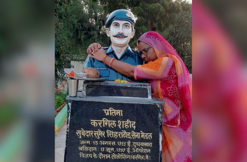 गांव दूधवाखारा में करगिल शहीद सुमेरसिंह की प्रतिमा से लिपट गई बहन सुमन कंवर।