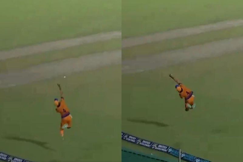जब मेदिनिपुर विजार्ज बल्लेबाजी कर रही थी तब पारी के 19वें ओवर की चौथी गेंद पर गौरव सिंह ने स्ट्रेट में गेंद को उठा दिया। ऐसा लगा कि गेंद बाउंड्री के बाहर चली जाएगी लेकिन बीच में अभिषेक दास ने छलांग लगाई और कैच लपक लिया।