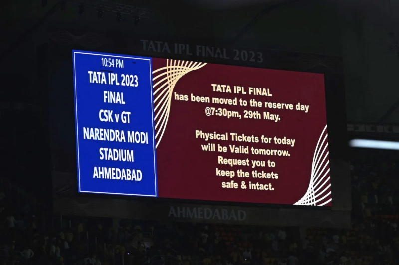 अहमदाबाद में लगातार बारिश के कारण मैच नहीं हो सका। देर रात 11 बजे बारिश रुकी, लेकिन मैदान को खेलने के योग्य बनाने में कम से कम एक घंटे लगते। उसके बाद अगर मैच होता तो सिर्फ पांच-पांच ओवर ही दोनों को मिलता। अंपायरों ने दोनों टीमों के कोच और कप्तान से बात कर मैच को टाल दिया। अब यह मैच आज शाम 7:30 बजे से खेला जाएगा और आईपीएल के इतिहास में यह पहली बार होगा जब रिजर्व डे पर चैंपियन का फैसला होगा।