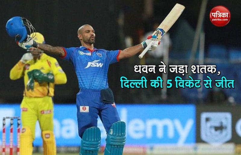 नई दिल्ली। शिखर धवन (Shikhar Dhawan) (नाबाद 101) की मुश्किल समय में खेली गई शतकीय पारी की मदद से दिल्ली कैपिटल्स (Delhi Capitals) ने शनिवार को इंडियन प्रीमियर लीग (आईपीएल) के 13वें सीजन (IPL 13 ) में शारजाह क्रिकेट स्टेडियम में खेले गए मैच में तीन बार की विजेता चेन्नई सुपर किंग्स (Chennai Super Kings) को पांच विकेट से हरा दिया। चेन्नई (Chennai) ने पहले बल्लेबाजी करते हुए फाफ डु प्लेसिस (Faf Du Plessis) (58 रन, 47 गेंद, 6 चौके, 2 छक्के), अंबाती रायूड (Ambati Rayudu) (नाबाद 45 रन, 25 गेंद, 4 छक्के, 1 चौका) और रवींद्र जडेजा ( Ravindra Jadeja) (33 रन, 13 गेंद, 4 छक्के) की मदद से 20 ओवरों में चार विकेट खोकर 179 रन बनाए। चेन्नई की खराब फील्डिंग ने दिल्ली को इस लक्ष्य को हासिल करने के भरपूर मौके दिए और दिल्ली ने 19.5 ओवरों में पांच विकेट खोकर इस लक्ष्य को हासिल कर लिया।