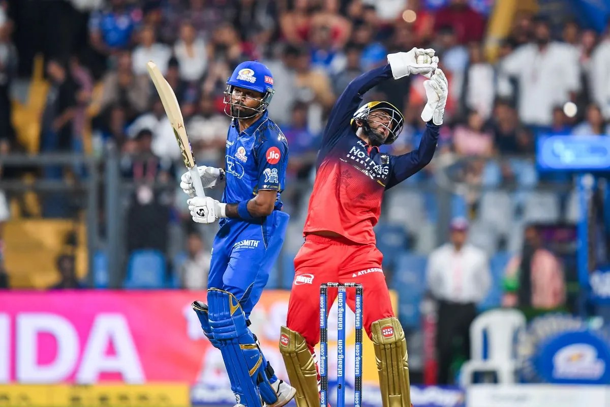 Hardik Pandya Punishment in IPL 2026: मुंबई इंडियंस के कप्तान हार्दिक पंड्या के खिलाफ कड़ा एक्शन लिया गया है। रविवार को मुंबई के वानखेड़े स्टेडियम में खेले गए MI vs RCB के मुकाबले में हार्दिक पंड्या की टीम से एक चूक हुई, जिसकी वजह से उनपर भारी भरकम जुर्माना लगा है। इसके अलावा रॉयल चैलेंजर्स बेंगलुरु के बल्लेबाज टिम डेविड पर भी मैच फीस का 25 प्रतिशत जुर्माना लगा है।