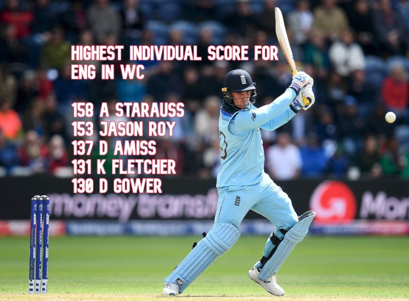 अपनी इस शानदार पारी की बदौलत जेसन रॉय ने अपना नाम वर्ल्ड कप रिकॉर्ड बुक में भी दर्ज करवा लिया है। रॉय इंग्लैंड की ओर से वर्ल्ड कप मैचों में दूसरी सबसे बड़ी पारी (व्यक्तिगत स्कोर) खेलने वाले बल्लेबाज बन गए हैं। इस सूची में पहले नंबर पर पूर्व कप्तान एड्यू स्ट्रॉस का नाम दर्ज है।