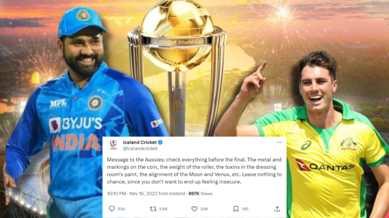 इसी बीच क्रिकेट जगत में अपनी फ़नी कमेंट्स के लिए प्रसिद्ध आइसलैंड क्रिकेट ने ऑस्ट्रेलियाई क्रिकेट टीम को वर्ल्ड कप फाइनल के लिए एक मजेदार सलाह दी है। उन्होंने अपने ट्विटर अकाउंट पर एक मज़ेदार ट्वीट शेयर करते हुए कहा -ऑस्ट्रेलिया को वर्ल्ड कप फाइनल से पहले मेज़बान टीम के खिलाफ हर एक चीज़ को जांचना चाहिए, जैसे कि रोलर का वजन, ड्रेसिंग रूम के पेंट में मौजूद ज़हरीले पदार्थ और यहाँ तक कि चंद्रमा और शुक्र के बीच की दूरी भी।