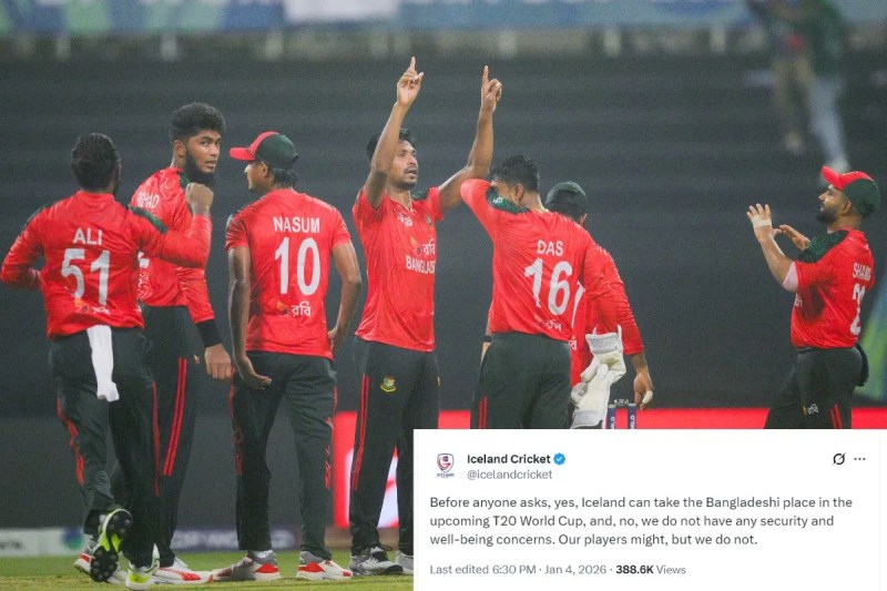 आइसलैंड क्रिकेट ने भारत-बांग्लादेश विवाद पर तंज कसते हुए सोशल मीडिया प्लेटफॉर्म 'एक्स' पर ट्वीट करते हुए लिखा कि वह वर्ल्ड कप में बांग्लादेश की जगह ले सकता है। ट्वीट में मजाकिया अंदाज में लिखा गया, 'इससे पहले कि कोई पूछे, हां, आने वाले टी20 विश्व कप में आइसलैंड की टीम बांग्लादेश की जगह ले सकती है। साथ ही हमें सुरक्षा और सलामती को लेकर कोई चिंता भी नहीं है। हमारे खिलाड़ियों यह चिंता हो सकती है, लेकिन हमें नहीं।'