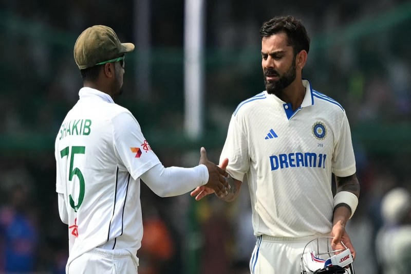 Virat Kohli gift a sign bat to Shakib Al Hasan: भारत और बांग्लादेश के बीच खेली जा रही दो मैचों की टेस्ट सीरीज का दूसरा मुक़ाबला कानपुर के ग्रीन पार्क स्टेडियम में खेला गया। बारिश से बाधित इस मुक़ाबले को भारत ने सात विकेट से अपने नाम करते हुए सीरीज 2-0 से क्लीन स्वीप कर दी। यह मैच बांग्लादेश के पूर्व कप्तान और दिग्गज ऑलराउंडर शाकिब अल हसन का आखिरी टेस्ट मुक़ाबला था।