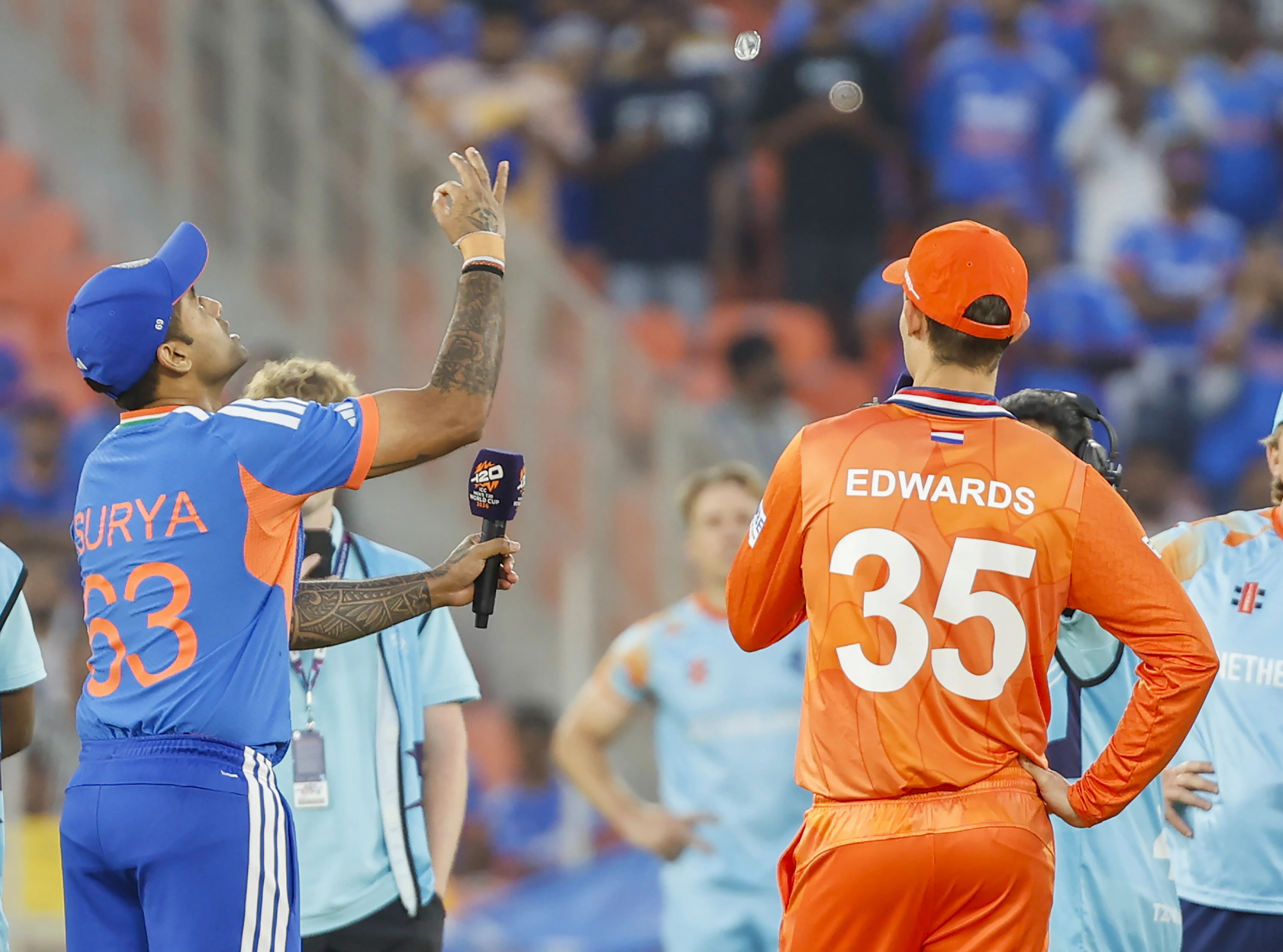 Ahmedabad: India's captain Suryakumar Yadav and Netherlands' captain Scott Edwards at the toss before the start of the ICC Men’s T20 World Cup 2026 match between India and Netherlands in Ahmedabad district of Gujarat, Wednesday, February 18, 2026. (IANS)