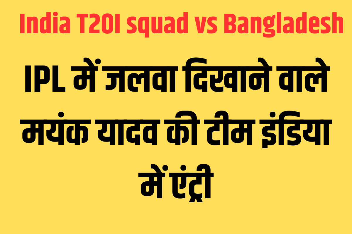 इंडियन प्रीमियर लीग (IPL) के पिछले सीजन में लखनऊ सुपर जायंट्स के लिए सुर्खियां बटोरने वाले तेज गेंदबाज मयंक यादव को उनकी गति और सटीकता की वजह से पहली बार राष्ट्रीय टीम में शामिल किया गया। टी-20 टीम में ईशान किशन को जगह नहीं मिल सकी है।