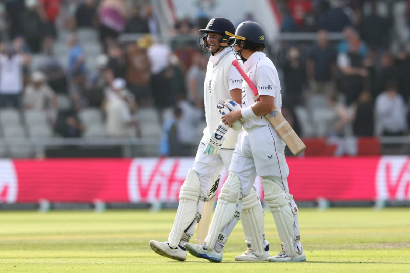 दिन का खेल खत्म होने के बाद जो रूट और ओली पोप मैदान से बाहर जाते हुए (Photo - EspnCricinfo)