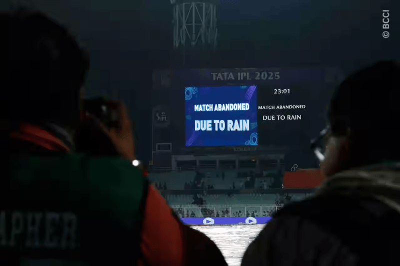 लक्ष्य का पीछा करने उतरी कोलकाता नाइट राइडर्स की टीम ने केवल एक ओवर का ही खेल पूरा किया, जिसमें टीम ने 7 रन बनाए। रहमनुल्लाह गुरबाज़ 1 रन और सुनील नरेन 4 रन बनाकर क्रीज़ पर नाबाद रहे। हालांकि, इसके बाद मौसम ने अचानक करवट ली और भारी बारिश के चलते मुकाबला बीच में ही रोकना पड़ा। हालात नहीं सुधरने पर मैच को अंततः रद्द घोषित कर दिया गया। आईपीएल के नियमों के अनुसार, रद्द हुए मुकाबले में दोनों टीमों को एक-एक अंक दे दिए गए।