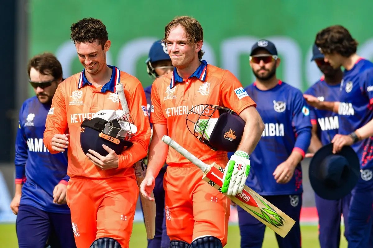 मैच जीतने के बाद पवेलियन लौटते नीदरलैंड के कप्तान स्कॉट एडवर्ड्स और बास डी लीडे। पीछे नामीबिया की टीम। (फोटो सोर्स: IANS)