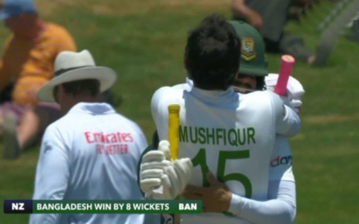 Bangladesh beat New Zealand: मुशफिकुर रहीम ने काइल जैमीसन द्वारा फेंके जा रहे 17वें ओवर की अंतिम गेंद पर जैसे ही ऑफसाइड की दिशा में चौका मारा वैसे ही बांग्लादेश टीम ने इतिहास रच दिया। बांग्लादेश ने न्यूजीलैंड को माउंट माउंगानुई में खेले जा रहे पहले टेस्ट मैच में 8 विकेट से रौंद दिया। बांग्लादेश ने 32 मुकाबलों के बाद न्यूजीलैंड में किसी फॉर्मेट में जीत हासिल की है। इससे पहले किसी भी फॉर्मेट में चाहे टी-20 हो या वनडे उसने न्यूजीलैंड में जीत हासिल नहीं की थी। इस ऐतिहासिक जीत के साथ ही बांग्लादेश टीम ने 2 मैचों की टेस्ट सीरीज में 1-0 की अजेय बढ़त बना ली है।