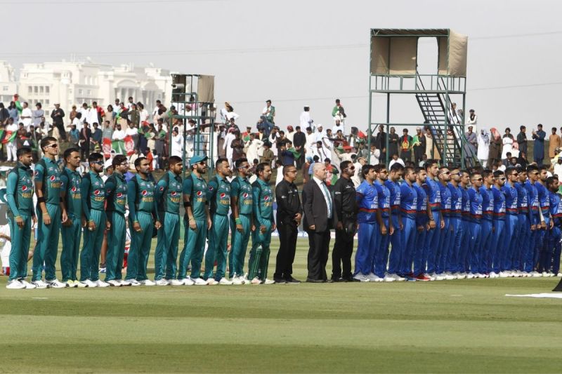 पाकिस्तान बनाम अफगानिस्तान मैच से पहले राष्ट्रगान के लिए एकजुट टीम। (फोटो सोर्स: IANS)