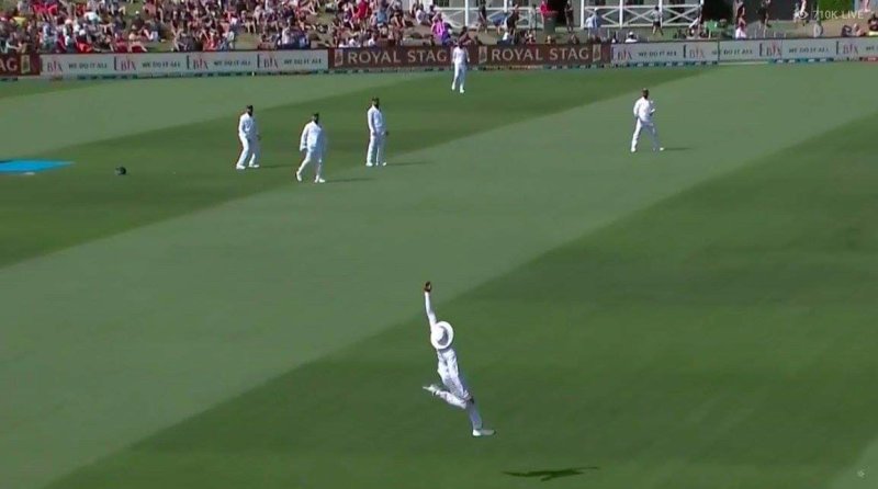 न्यूजीलैंड की पारी का 72वां ओवर चल रहा था और क्रीज पर नील वैग्नर और काइली जैमीसन बल्लेबाजी कर रहे थे। जैमीसन सेट हो चुके थे। इसी ओवर की आखिरी गेंद पर नील वैग्नर ने स्क्वायर लेग के ऊपर से खेलने की कोशिश की। वहां रवींद्र जड़ेजा फील्डिंग कर रहे थे। बाउंड्री लाइन से कई मीटर आगे खड़े जड़ेजा ने गेंद की टाइमिंग के हिसाब से हवा में छलांग लगाई और एक हाथ से ही जबरदस्त कैच पकड़ लिया।