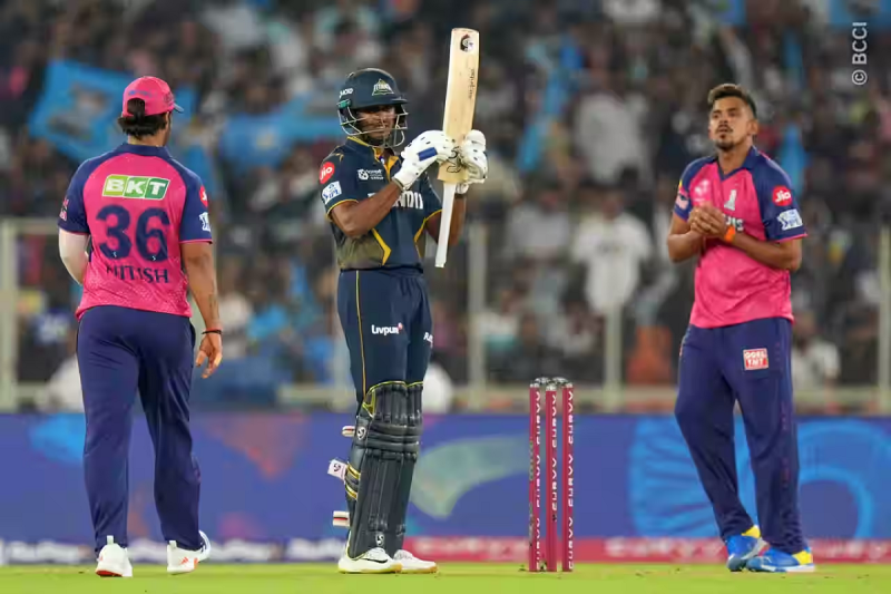 गुजरात को पहला झटका महज़ 14 रन पर लगा, जब जोफ्रा आर्चर ने कप्तान शुभमन गिल को क्लीन बोल्ड कर पवेलियन भेजा। गिल केवल 2 रन ही बना सके। इसके बाद साई सुदर्शन और जोस बटलर ने पारी को संभाला और दूसरे विकेट के लिए 80 रनों की अहम साझेदारी की। 94 के स्कोर पर महीश तीक्षणा ने बटलर को एलबीडब्ल्यू आउट कर राजस्थान को दूसरी सफलता दिलाई।