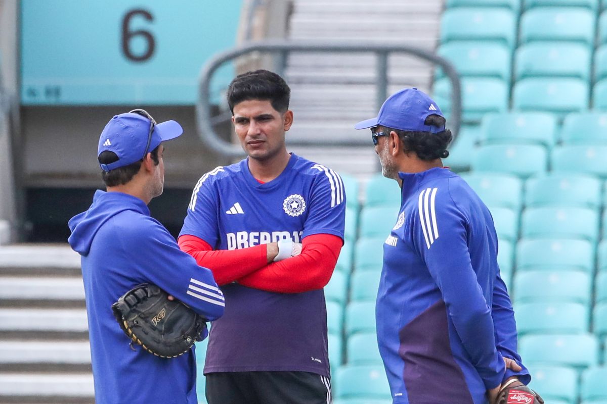 हेड कोच गौतम गंभीर और सहायक कोच सितांशु कोटक से बात करते शुभमन गिल। (फोटो सोर्स: IANS)
