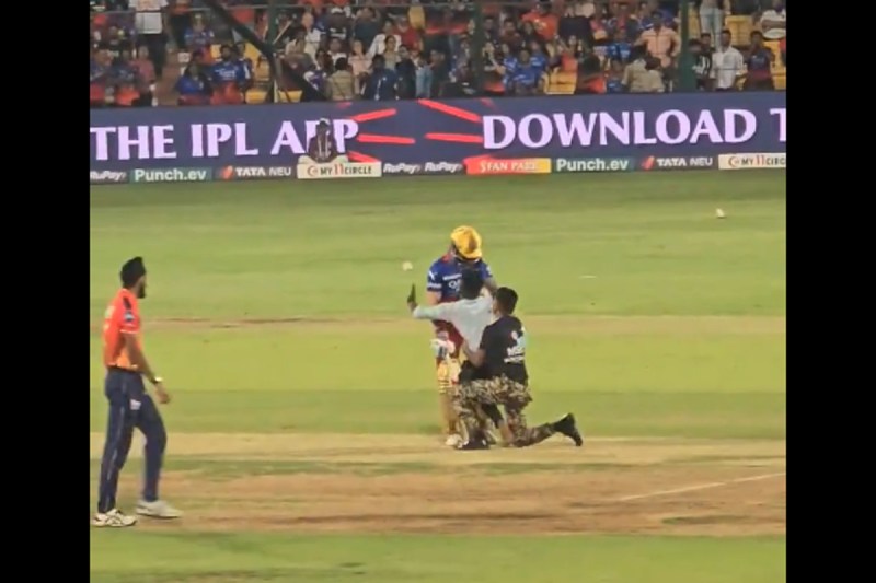 दरअसल, पंजाब किंग्स ने आरसीबी के सामने 177 रनों का लक्ष्य रखा था। इसके जवाब में बल्लेबाजी करने उतरे विराट कोहली ने 49 गेंदों पर 77 रनों की पारी खेली। जब कोहली बल्लेबाजी कर रहे थे, उसी समय सुरक्षा में चूक का मामला सामने आया। एक फैन अचानक मैदान में घुसा और सीधे कोहली के पैरों में गिर गया। उसके पीछे एक सुरक्षाकमी भी दौड़कर आया। उसने फैन को उठाया, लेकिन वह कोहली से लिपट गया। इसके बाद दूसरा गार्ड आया और फिर उस दर्शक को बाहर ले जाया गया।