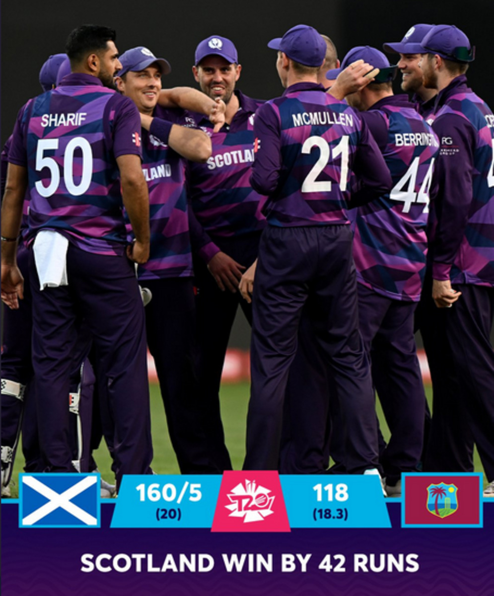 ऑस्ट्रेलिया में रविवार 16 अक्टूबर से शुरू हुए टी-20 वर्ल्ड कप (T-20 World Cup) 2022 में उलटफेर का सिलसिला जारी है। पहले दिन के बाद दूसरे दिन फिर उलटफेर देखने को मिला, जब स्कॉटलैंड (Scotland) ने पूर्व चैंपियन वेस्ट इंडीज़ (West Indies) को ग्रुप स्टेज में 42 रनों से हरा दिया। टॉस हारकर पहले बैटिंग करने उत्तरी स्कॉटलैंड की टीम ने शानदार बैटिंग करते हुए 20 ओवर में 5 विकेट पर 160 का स्कोर बनाते हुए वेस्ट इंडीज़ को 161 रनों का लक्ष्य दिया। जवाब में वेस्ट इंडीज़ की टीम 18.3 ओवरों में 118 रन बनाकर ही ऑल आउट हो गई।