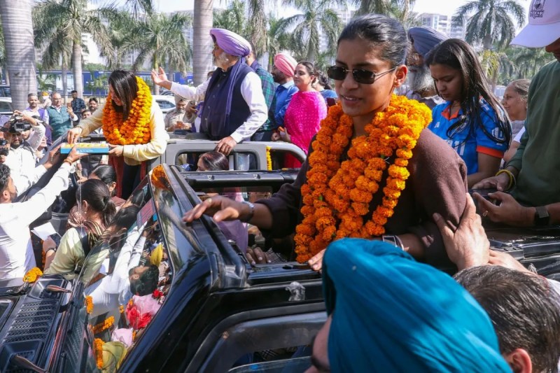 विश्व विजेता हरलीन देयोल और अमनजोत कौर का चंडीगढ़ में भव्य स्वागत किया गया। (फोटो सोर्स: IANS)