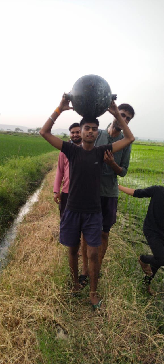 सुरक्षा की ²ष्टि से ग्रामीणों को खेत के अंदर नहीं जाने दिया। कुछ बच्चे उस गोले को अपने सिर पर रखकर खेलते हुए दिखाई दिए जिसका फोटो वायरल हो रहा है। ग्वालियर से बम डिस्पजोल टीम पहुंच गई है। गोले की जांच में जुट गई है।