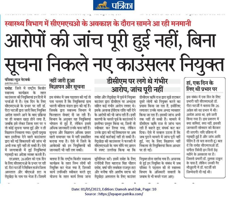 दमोह. हायर सेकंडरी स्कूल बनवार में प्राचार्य के पद पर बिना रहे भी सीट संभालने, वित्तीय गड़बड़ी करने, बोर्ड परीक्षा में गड़बड़ी करने और जांच में दस्तावेज मांगने पर जलाने जैसे आरोप झेल रहे उमाशि एसके मिश्रा को लोक शिक्षण संचालनालय आयुक्त द्वारा निलंबित कर दिया गया है। पत्रिका द्वारा पूरे मामले को सामने लाया गया था। इसके बाद संभागीय संयुक्त संचालक ने मामले की बारीकी से जांच कराई थी। जिसमें काफी गड़बड़ी सामने आई थी। इसके बाद सामने आए प्रतिवेदनों के आधार पर यह कार्रवाई की गई। मामले में डीइओ दमोह को भी नोटिस जारी कर जानकारी चाही गई है।