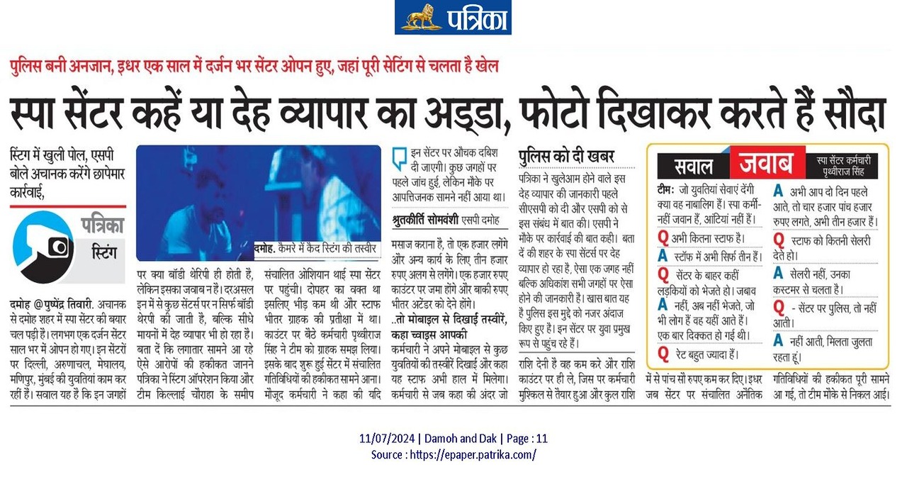 दमोह. अचानक से दमोह शहर में स्पा सेंटर की बयार चल पड़ी है। लगभग एक दर्जन सेंटर साल भर में ओपन हो गए। इन सेंटरों पर दिल्ली, अरुणाचल, मेघालय, मणिपुर, मुंबई की युवतियां काम कर रहीं हैं। सवाल यह है कि इन जगहों पर क्या बॉडी थेरिपी ही होती है, लेकिन इसका जवाब न है। दरअसल इन में से कुछ सेंटर्स पर न सिर्फ बॉडी थेरपी की जाती है, बल्कि सीधे मायनों में देह व्यापार भी हो रहा है। बता दें कि लगातार सामने आ रहे ऐसे आरोपों की हकीकत जानने पत्रिका ने स्टिंग ऑपरेशन किया और टीम किल्लाई चौराहा के समीप संचालित ओशियान थाई स्पा सेंटर पर पहुंची। दोपहर का वक्त था इसलिए भीड़ कम थी और स्टाफ भीतर ग्राहक की प्रतीक्षा में था। काउंटर पर बैठे कर्मचारी पृथ्वीराज सिंह ने टीम को ग्राहक समझ लिया। इसके बाद शुरू हुई सेंटर में संचालित गतिविधियों की हकीकत सामने आना। मौजूद कर्मचारी ने कहा की यदि मसाज कराना है, तो एक हजार लगेंगे और अन्य कार्य के लिए तीन हजार रुपए अलग से लगेंगे। एक हजार रुपए काउंटर पर जमा होंगे और बाकी रुपए भीतर अटेंडर को देने होंगे। ..तो मोबाइल से दिखाईं तस्वीरें, कहा च्वाइस आपकी कर्मचारी ने अपने मोबाइल से कुछ युवतियों की तस्वीरें दिखाईं और कहा यह स्टाफ अभी हाल में मिलेगा। कर्मचारी से जब कहा की अंदर जो राशि देनी है वह कम करे और राशि काउंटर पर ही ले, जिस पर कर्मचारी मुश्किल से तैयार हुआ और कुल राशि में से पांच सौ रुपए कम कर दिए। इधर जब सेंटर पर संचालित अनैतिक गतिविधियों की हकीकत पूरी सामने आ गई, तो टीम मौके से निकल आई। पुलिस को दी खबर पत्रिका ने खुलेआम होने वाले इस देह व्यापार की जानकारी पहले सीएसपी को दी और एसपी को से इस संबंध में बात की। एसपी ने मौके पर कार्रवाई की बात कही। बता दें की शहर के स्पा सेंटर्स पर देह व्यापार हो रहा है, ऐसा एक जगह नहीं बल्कि अधिकांश सभी जगहों पर ऐसा होने की जानकारी है। खास बात यह है पुलिस इस मुद्दे को नजर अंदाज किए हुए है। इन सेंटर पर युवा प्रमुख रूप से पहुंच रहे हैं। मामले की हकीकत के सवाल जवाब टीम - जो युवतियां सेवाएं देंगी क्या वह नाबालिग हैं।स्पा कर्मी- नहीं जवान हैं, आंटियां नहीं हैं। सवाल- अभी कितना स्टाफ है। जबाव - स्टॉफ में अभी सिर्फ तीन हैं। सवाल - सेंटर के बाहर कहीं लड़कियों को भेजते हो। जबाव - नहीं, अब नहीं भेजते, जो भी लोग हैं वह यहीं आते हैं। एक बार दिक्कत हो गई थी। सवाल - रेट बहुत ज्यादा हैं। जबाव - अभी आप दो दिन पहले आते, तो चार हजार पांच हजार रुपए लगते, अभी तीन हजार हैं। सवाल- स्टाफ को कितनी सेलरी देते हो। जबाव - सेलरी नहीं, उनका कस्टमर से चलता है। सवाल - सेंटर पर पुलिस, तो नहीं आती। जबाव - नहीं आती, मिलता जुलता रहता हूं। वर्जन इन सेंटर पर औचक दबिश दी जाएगी। कुछ जगहों पर पहले जांच हुई, लेकिन म