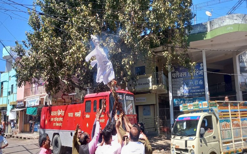 हटा. पंचायत व ग्रामीण मंत्री प्रहलाद पटेल के भिखारी वाला बयान सुर्खियों में छाया हुआ है। जिसको लेकर सियासी पारा भी चरम पर पहुच गया है। प्रहलाद पटेल के खिलाफ कांग्रेस ने सड़क पर उतरकर जमकर विरोध प्रदर्शन किया और पुतला दहन किया। हटा में कांग्रेसियों ने राय चौराहे पर प्रहलाद पटेल मुर्दाबाद के नारे लगाते हुए पुतला जलाया तो मौके पर मौजूद हटा पुलिस ने कांग्रेसियों के ऊपर दमकल वाहन से पानी की बौछार की और पुतला छीन लिया ।