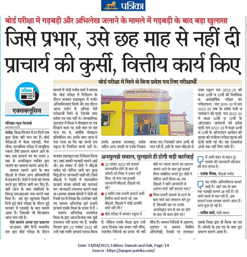इधर, दमोह में उनके विरुद्ध चल रही जांच फिर ठंडे बस्ते में हैं। दूसरे पक्ष के बयानों में देरी की जा रही हैं। जिसके बाद ही कार्रवाई प्रस्तावित की जाएगी। हालांकि, यह तय है कि डीसीएम के पद से हटने के बाद अब जांच में स्पष्टता देखने मिल सकती है। बता दें कि मामले को लेकर पत्रिका द्वारा लगातार खबरें प्रकाशित की जा रही हैं।