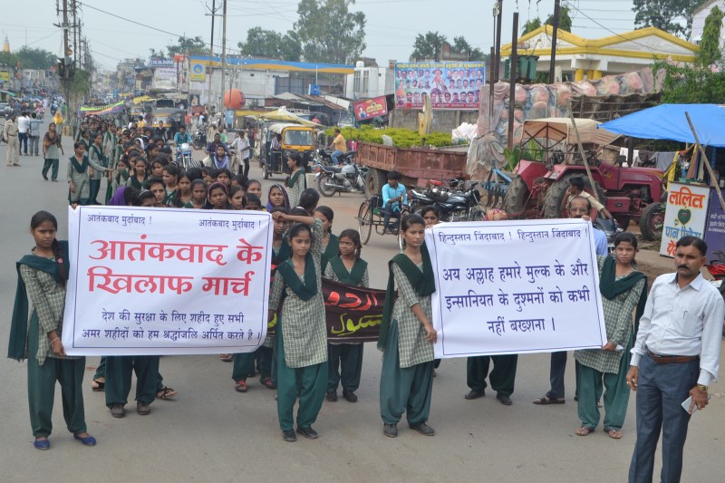 दमोह। शहर के उच्चतर माध्यमिक ऊर्दू स्कूल के छात्र-छात्राओं ने गुरूवार की दोपहर एक विशाल रैली निकाली। रैली में सैकड़ों छात्र-छात्राएं मौजूद रहे। छात्राओं के हाथों में आंतकवाद के खिलाफ लिखे स्लोगन के बैनर रहे। इस दौरान छात्राओं में आतंकवाद के खिलाफ अपनी आवाज बुलंद की। रैली शहर के मुख्य मार्गों से होकर निकाली गई व इस दौरान स्कूल के सभी शिक्षक मौजूद रहे। कतारबद्ध निकली इस रैली की सभी ने सराहना भी की।