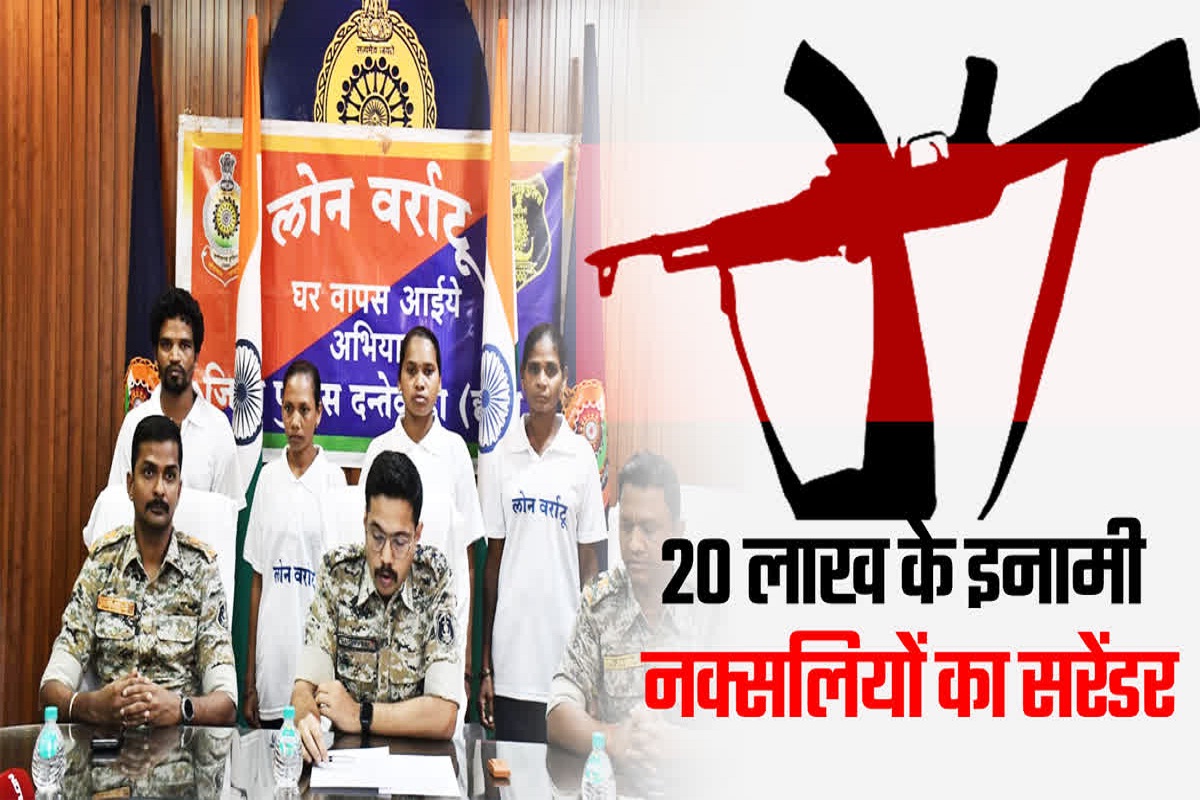 Naxalites Surrendered In Dantewada: छत्तीसगढ़ के दंतेवाड़ा जिले में तीन महिला नक्सलियों और एक पुरुष नक्सली ने आत्मसमर्पण कर दिया। इन नक्सलियों पर कुल 20 लाख रुपए का इनाम घोषित किया गया था। बता दें कि लोन वर्राटू अभियान से प्रभावित होकर नक्सली दंपती समेत कुल चार नक्सलियों ने आज एसपी गौरव रॉय के समक्ष सरेंडर किया है।