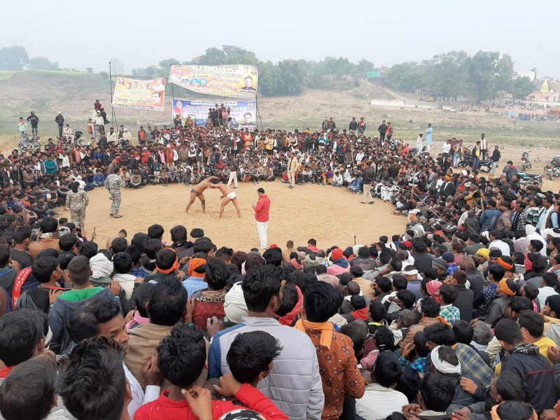 दंगल के आयोजन में पहलवानों के बीच हुई कुश्ती को देखने उमड़ा जनसैलाब।