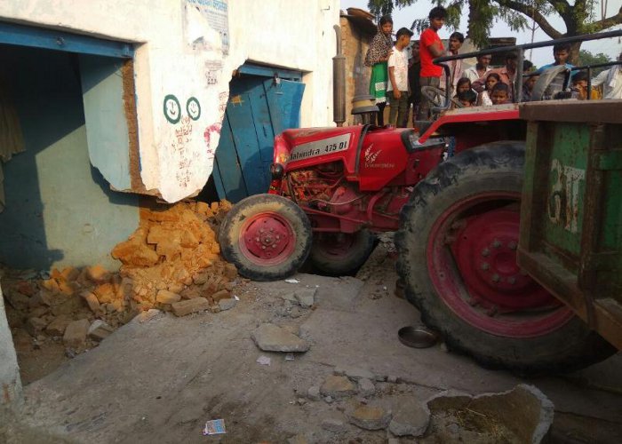 रविवार शाम साढ़े चार बजे एक ट्रैक्टर चालक ने अपना संतुलन खो दिया और उसने पहले विशाल की गुमटी को रौंदा उसके बाद दुकान में घुस गया। इससे दुकान का आगे का हिस्सा क्षतिग्रस्त हो गया। गनीमत यह रही कि ट्राली नाले में फंस जाने की वजह से आगे नहीं गई और ट्रैक्टर दुकान की दीवार से टकरा कर रूक गया।