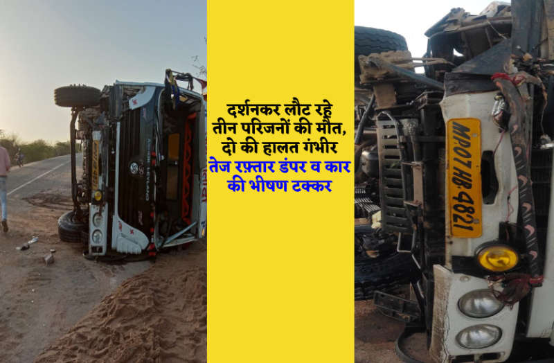बताया जाता है कि सेवढा निवासी शिक्षक अवधेश त्रिपाठी पत्नी एवं रिश्तेदारों के साथ दंदरौआ सरकार मंदिर से दर्शन कर लौट रहे थे. तभी मगरोल घाटी पर रात्रि 11 बजे सेवढा की तरफ से जा रहे डंपर ने सामने से टक्कर मारी. इस हादसे में शशि मिश्रा रानी त्रिपाठी, छोटू दुबे की मौत हो गई. गंभीर रूप से घायल अवधेश त्रिपाठी और पत्नी संगीता त्रिपाठी गंभीर रूप से घायल हुए. दोनों को ग्वालियर रेफर किया गया. डीपार पुलिस ने मामला दर्ज किया है.