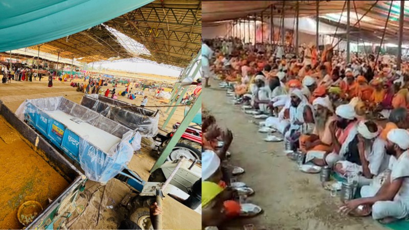 भंडारे में प्रसादी लेते संत व ट्रॉलियों में भरी खीर सब्जी एवं पुआ की प्रसादी: फोटो पत्रिका