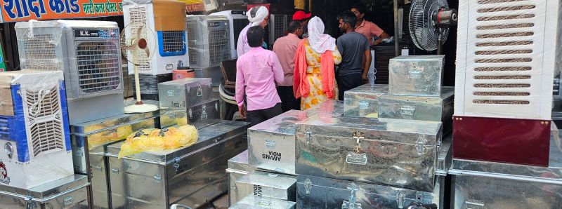 लालसोट की पुरानी अनाज मंडी में एक कूलर विक्रेता की दुकान पर मौजूद ग्राहक।