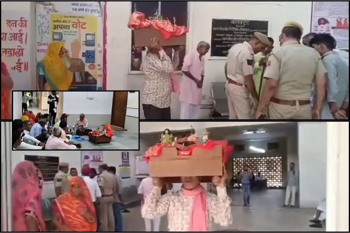मंदिर से ठाकुर जी को सिर पर उठाए कलेक्टर ऑफिस पहुंंचे लोग, फोटो - पत्रिका