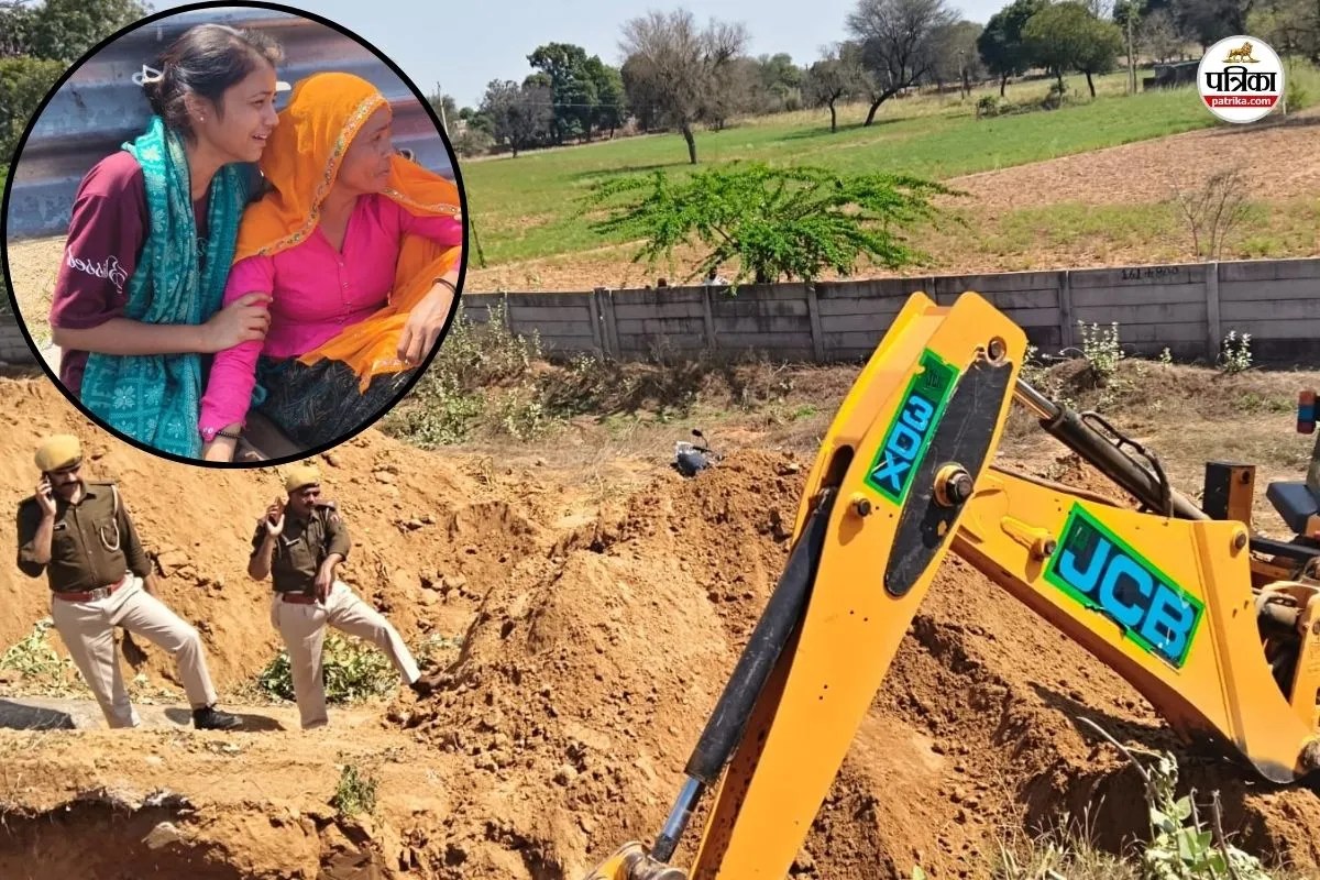 प्रिंस की तलाश के लिए जेसीबी से खुदाई करते हुए व इनसेट में विलाप करती मां-बहन। फोटो: पत्रिका